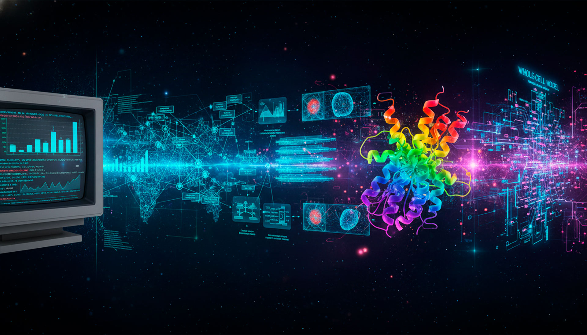 - Modelagem de célula completa (Whole-Cell Modeling): A próxima meta é integrar todos os dados ômicos (genoma, proteoma, metaboloma) de uma célula individual em um modelo de IA dinâmico e preditivo. Isso permitiria simular o efeito de qualquer droga ou mudança ambiental com alta fidelidade.